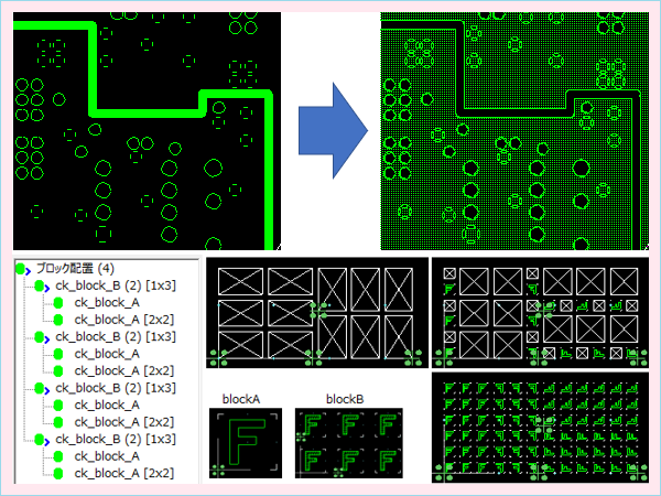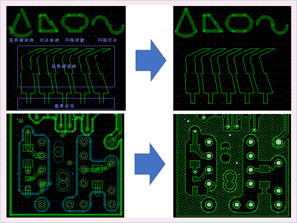 ◆主な編集コマンド機能 微細断線の一括修正、塗り抜き階層のまとめ。 ネガ変換、ブロックの展開編集。