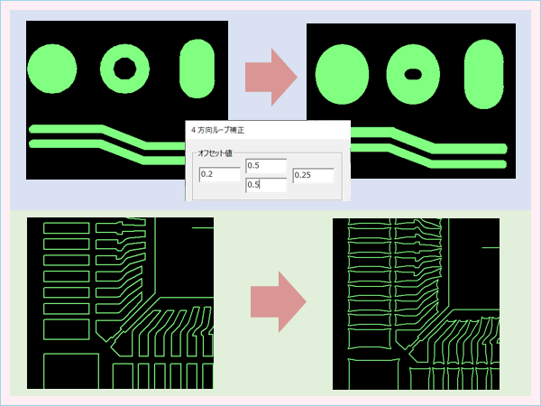 ◆補正機能:4方向ループ補正 ⇒4方向で異なる値を指定する事でき、ベタループを対象に補正を一括実行します。