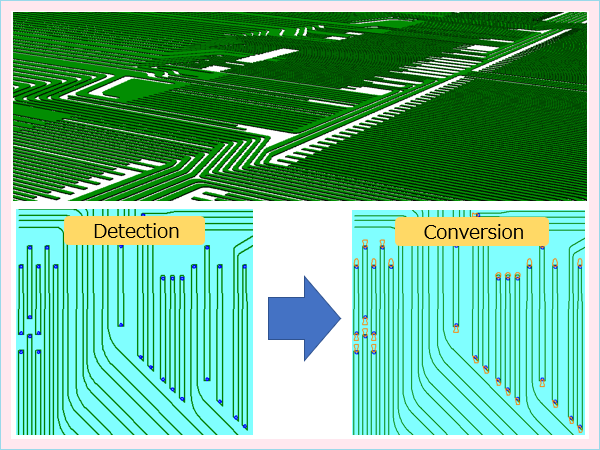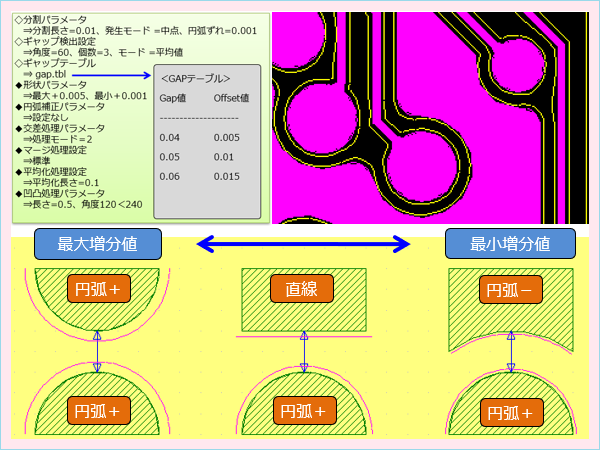 周囲のギャップや対象オブジェクト、さらに指定のパターン形状で対象場所を検出して、指定の補正を実行します。